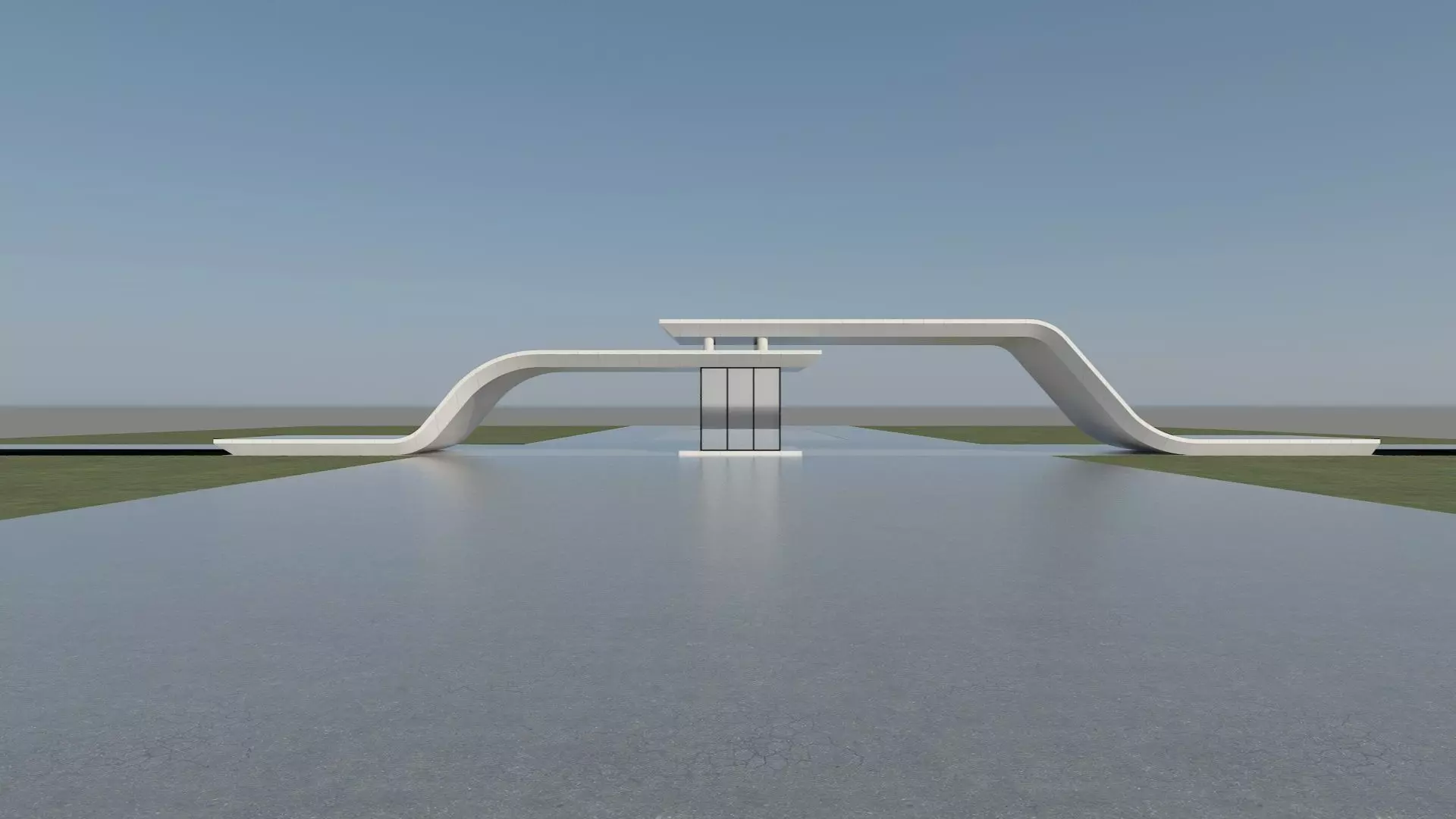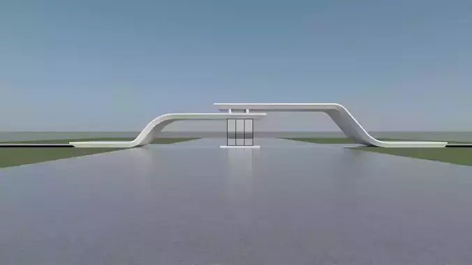 This is a public architectural model in a modern minimalist style. Centered on smooth white curved surfaces, it features concise yet dynamic lines, paired with transparent glass components, presenting an overall visual effect of lightness and futuristic appeal.The building is set in an open environment of waterscapes and lawns, boasting a simple and grand style that combines artistic charm with spatial tension.