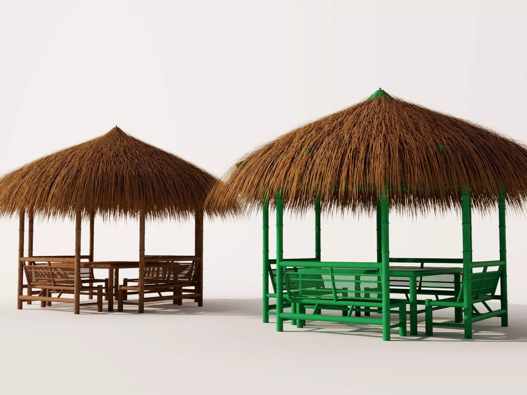 High-quality pack of tropical bamboo pavilion and thatched gazebo 3D models, featuring: round/square bamboo-framed structures with thatched roofs, woven rattan seating benches, central round/rectangular tables, green bamboo poles, natural leaf accents, and detailed outdoor leisure/resort props.Models built to real-world scale with high detail — realistic bamboo texture grain, thatch straw layering, rattan weave patterns, wood joint realism, subtle weathering, and authentic tropical garden pavilion realism.Full PBR workflow with high-res textures (2K-4K): Albedo, Roughness, Metallic, Normal, AO maps for realistic bamboo roughness, thatch fiber detail, rattan softness, and depth in any lighting.Ideal for:• Architectural visualization and garden/patio renders• Tropical resort, backyard leisure, and outdoor seating builds• Vacation villa, beach hut, and relaxation area scenes• Game assets (Unity/Unreal ready)• VR/AR outdoor resort tours and tropical experiences• VFX, promotional videos, landscape designOptimized polycount for real-time — drag and drop to enhance scenes instantly.Compatible formats:MAX (with materials), OBJ, FBXCompatible with 3ds Max, Maya, Blender, Cinema 4D, Unity, Unreal Engine, and more.