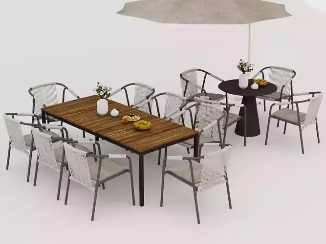 Modern outdoor dining furniture, designed specifically for patios, gardens, balconies, cafes, and resort environments. The set includes a rectangular wooden dining table, multiple metal-framed, rope-woven armchairs, a round side table, and a cantilevered outdoor umbrella.The combination of warm wood textures, soft rope weaving, and minimalist metal structures creates a fresh and modern outdoor ambiance.All models are accurately scaled and detailed, suitable for architectural visualization, product rendering, and real-time projects.Materials are optimized for realistic rendering and are easily customizable.Suitable for: Outdoor dining scenes, garden and patio visualizations, restaurant and cafe exteriors, resort and hotel environmentsFeatures:Modern outdoor furniture design, clean topology for direct rendering, realistic wood, rope, and fabric materials, suitable for close-up and wide shots