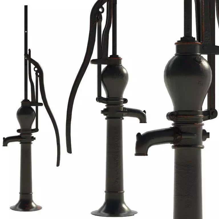 Oshkosh water hand pump 3D model, hand water pump 3Ds Max, outdoor pump OBJ, V-Ray exterior prop, low-poly garden pump 3D.