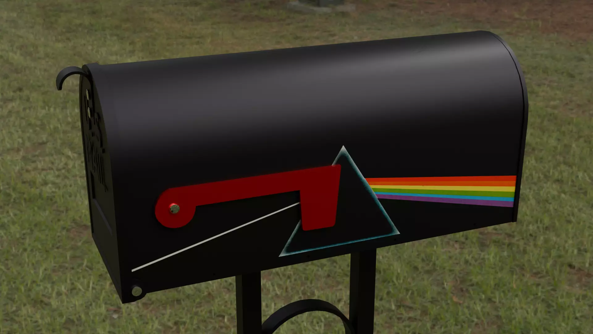 This model features a painted mailbox inspired by Dark Side of the Moon, with the iconic artwork displayed on both side panels. The mailbox itself is a standard black metal design, and the front door remains solid black for a clean, classic look. On the side, a sharp white beam enters the familiar triangular prism, where it splits into a vivid, neatly separated rainbow. The spectrum then runs the full length of the box, following the curve toward the back. The colors are bright and smooth, creating a striking contrast against the deep black surface. Soft space-like shading fills the remaining areas, adding depth without overpowering the prism. Mounted on a simple metal post, it becomes a bold tribute to Pink Floyd’s legendary album art.