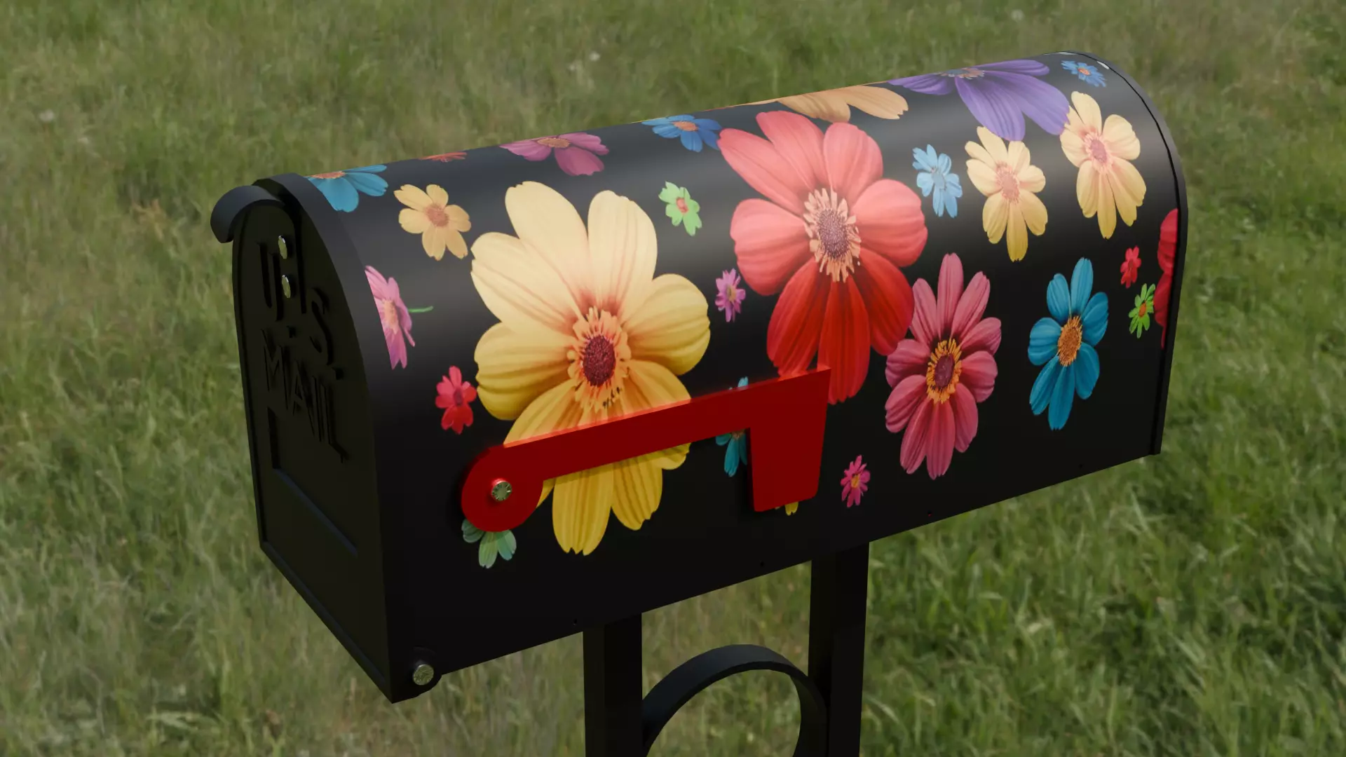 This model features a painted mailbox covered in bright, colorful flowers. The base is a standard black metal mailbox, sturdy and classic in shape, with the front door remaining solid black to maintain a clean, functional look. Unlike simpler designs, the top and side panels are completely adorned with hand-painted blooms in a variety of vibrant colors—reds, yellows, pinks, blues, and purples—creating a cheerful, eye-catching pattern. The decorative post remains the same simple metal scrollwork style, providing stable support while allowing the vivid floral artwork to be the main focus. This mailbox brings a joyful, artistic touch to any yard.