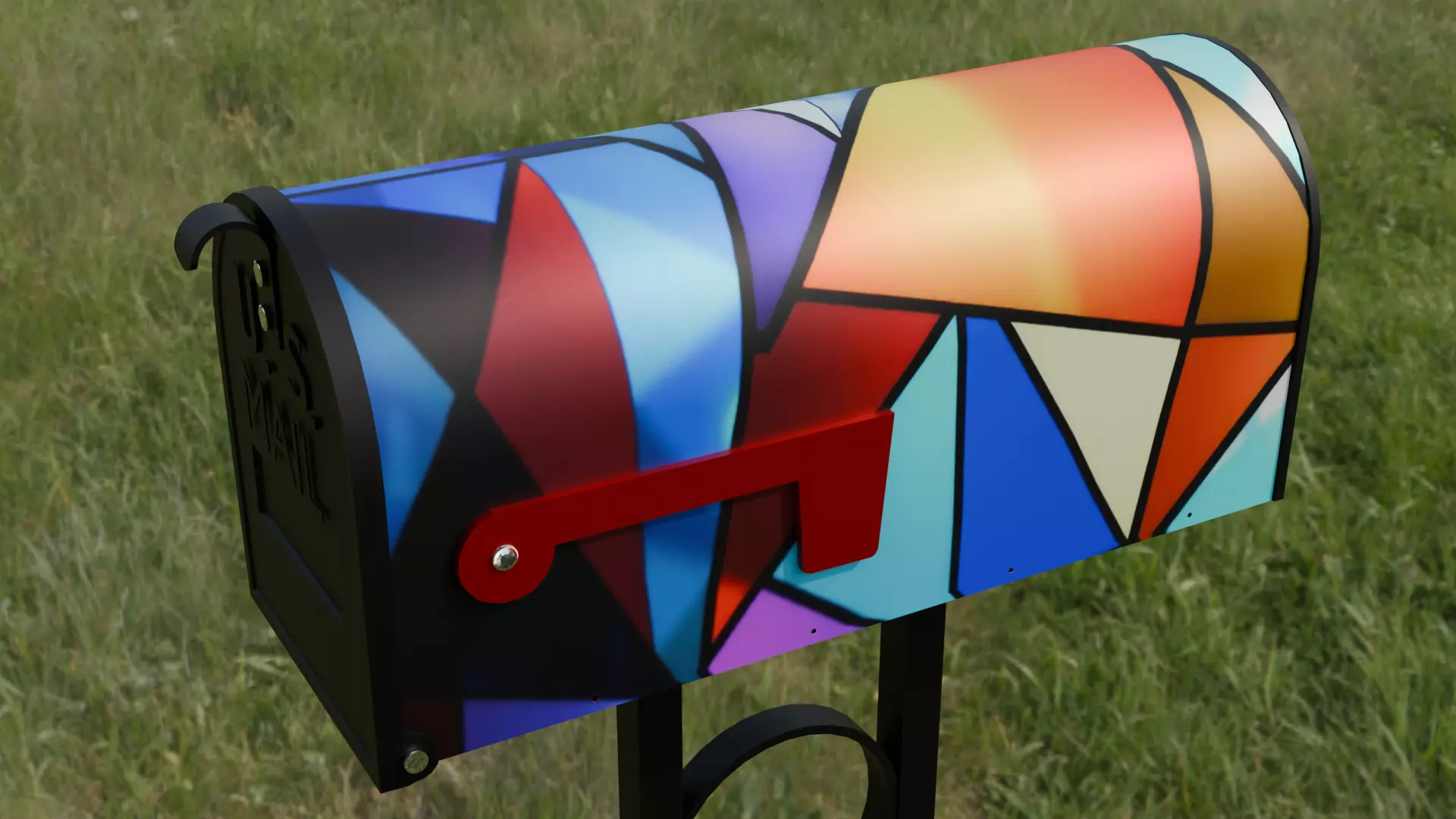 This model features a painted mailbox adorned with colorful geometric designs. The base is a standard black metal mailbox, sturdy and familiar in shape, with the front door kept solid black for a clean look. The top and side panels are covered in a pattern of overlapping triangles in a variety of bright, vivid colors, creating a striking stained-glass effect. Each triangle is carefully painted with crisp edges and rich tones, giving the mailbox a bold, artistic appearance. The geometric pattern wraps naturally around the curved surfaces, adding depth and visual interest from every angle. Mounted on the same simple metal scrollwork post, this mailbox becomes a unique, eye-catching addition to any yard or driveway.