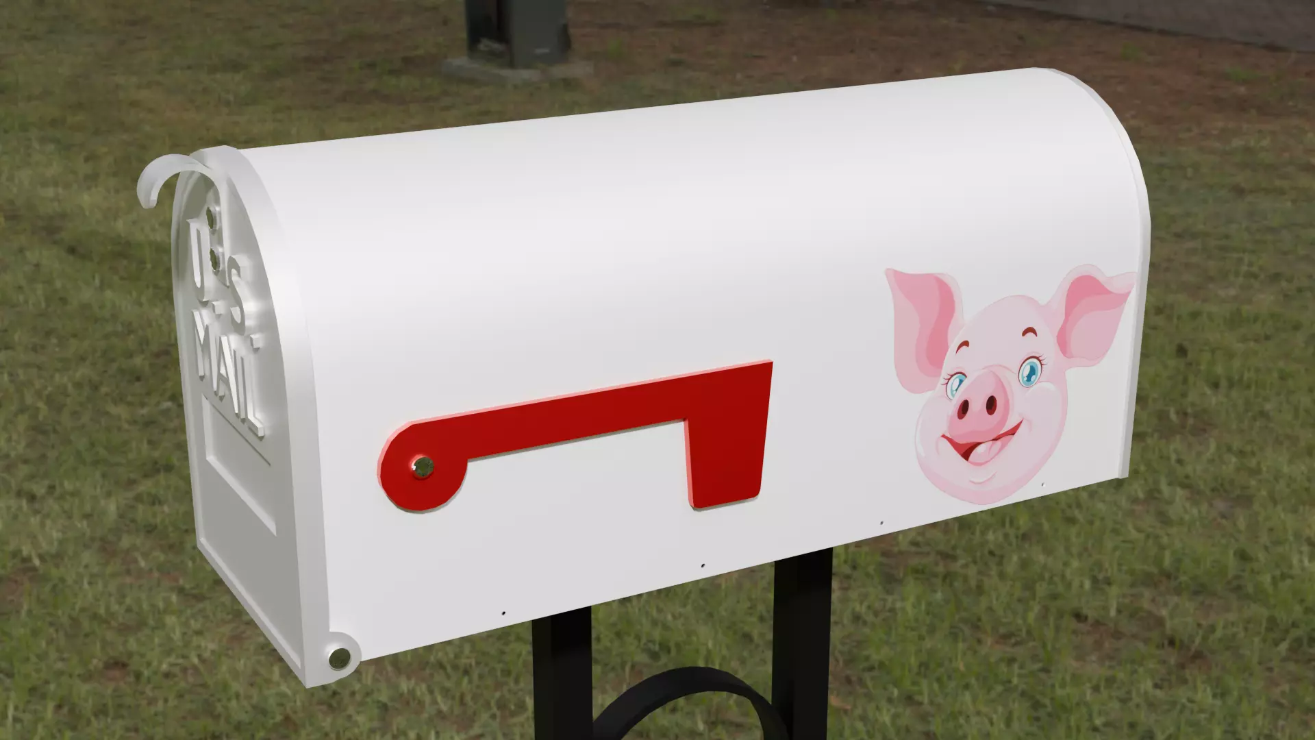 Add a playful, rustic touch to your scene with this unique 3D model of a custom-painted mailbox. The standard white mailbox features an adorable, hand-painted design: a delightful pig face is prominently featured in the lower right corner, offering a friendly, characterful element to any exterior setting.