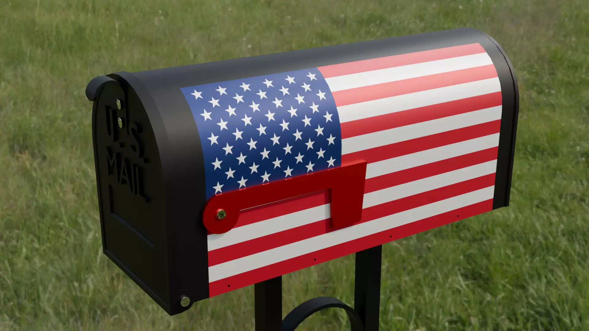 This is a high-detail, ready-to-use 3D model of a classic American roadside mailbox, distinguished by a custom, hand-painted United States Flag design on both sides of the box. Ideal for architectural visualization, realistic game environments, or detailed residential scenes.