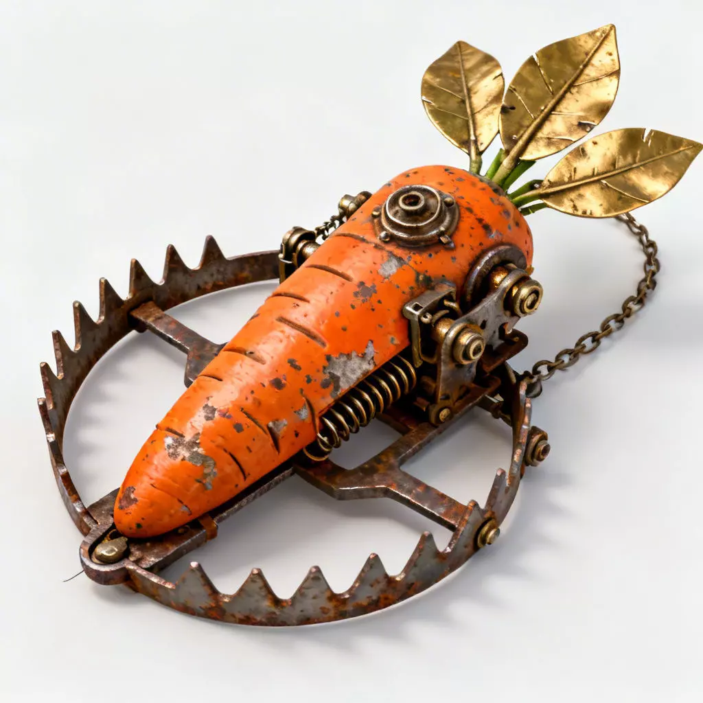 Ornate Brass Foliage and Security ChainThe carrot is characterized by three prominent, hand-carved brass leaves at the crown, serving as the primary aesthetic focal point of the lure. This is complemented by a heavy-duty, rusted iron security chain attached to the rear of the trap, reinforcing the asset's status as a functional, high-impact mechanical device.