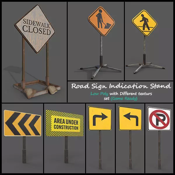 4 Road Sign Indication Stand With Different texture sets Game Ready