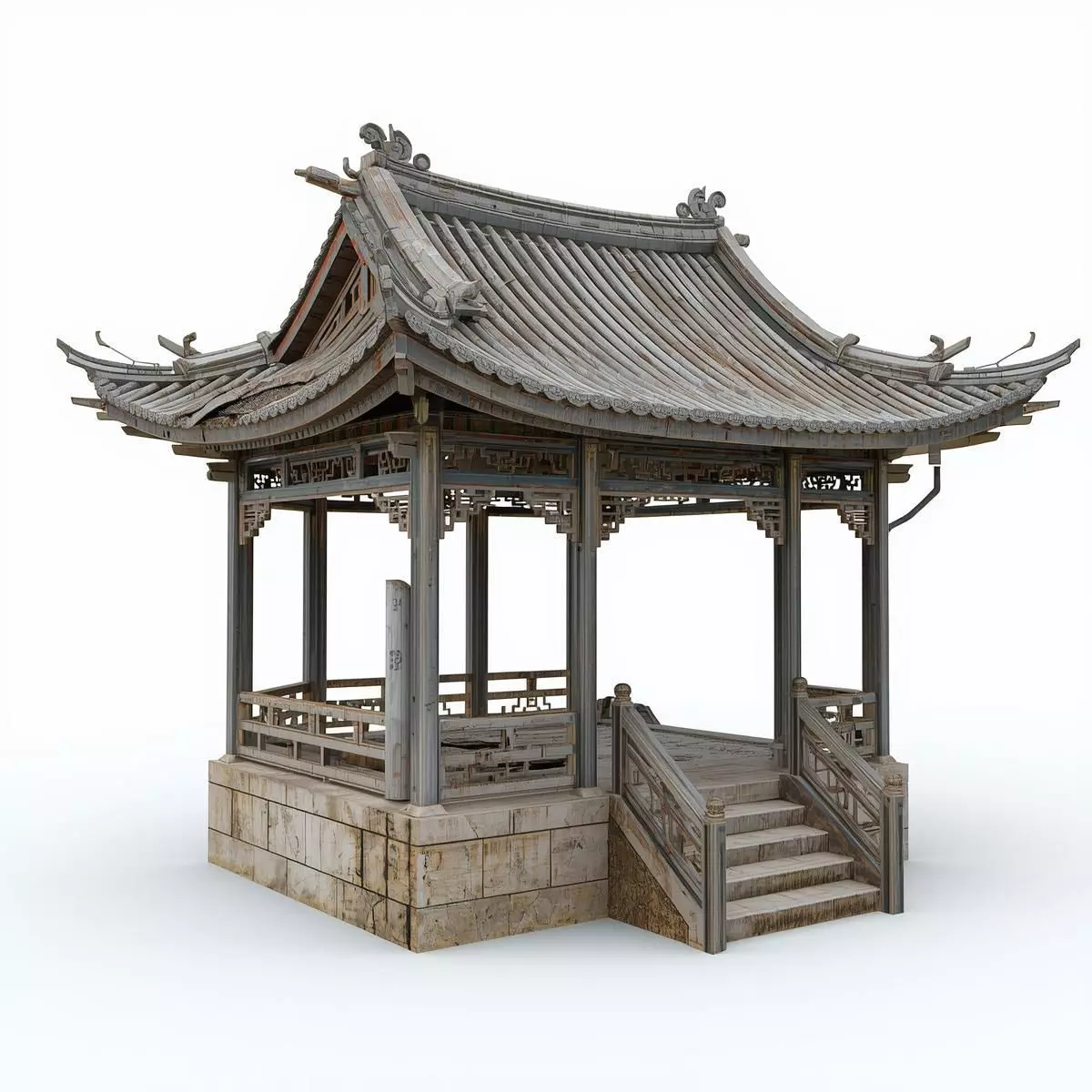 Tags3d model Chinese pavilion ruined architecture ancient structure broken beams cracked stone curved roof weathered textures oriental design historical asset game ready prop fantasy environment isolated structure pbr materials digital diorama classical architecture