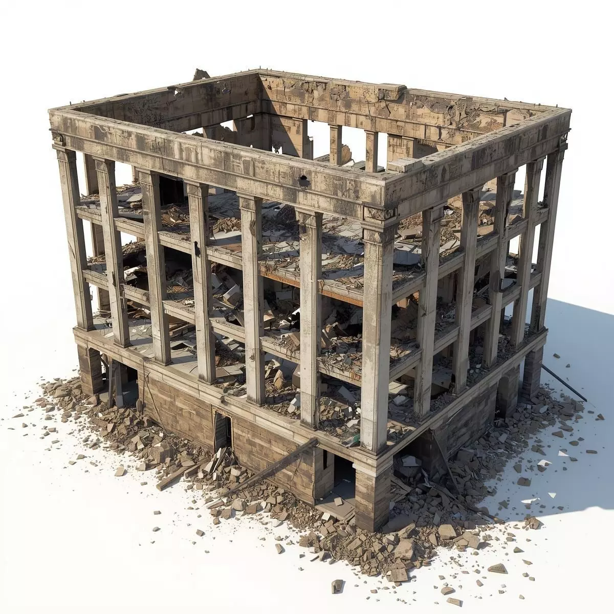 Complex Internal Decay: Shows collapsed internal floors and exposed structural supports from above.