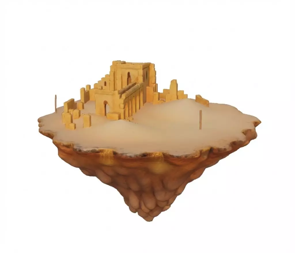 Weathered Sandstone Architecture The centerpiece features detailed ruins, including crumbling arches, eroded staircases, and fortified walls. The texture work emphasizes centuries of exposure to the sun and wind, providing a realistic ancient aesthetic.