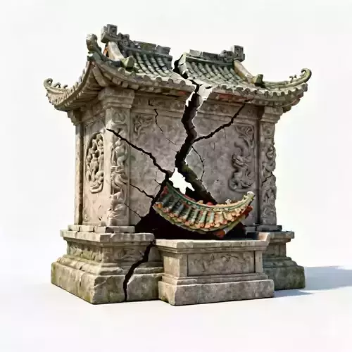 The Overall Concept This is a piece of environmental storytelling for an ancient or fantasy setting. It represents a forgotten roadside shrine or a small spirit house that has been destroyed by time, an earthquake, or a magical battle.