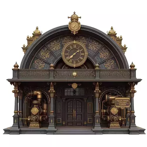 DescriptionA premium, ultra-detailed 3D model of a grand travel hub featuring a sophisticated Victorian industrial steampunk aesthetic. The structure is characterized by massive, reinforced iron arches and intricate brass filigree integrated into a classic dark-stone and red-brick facade.