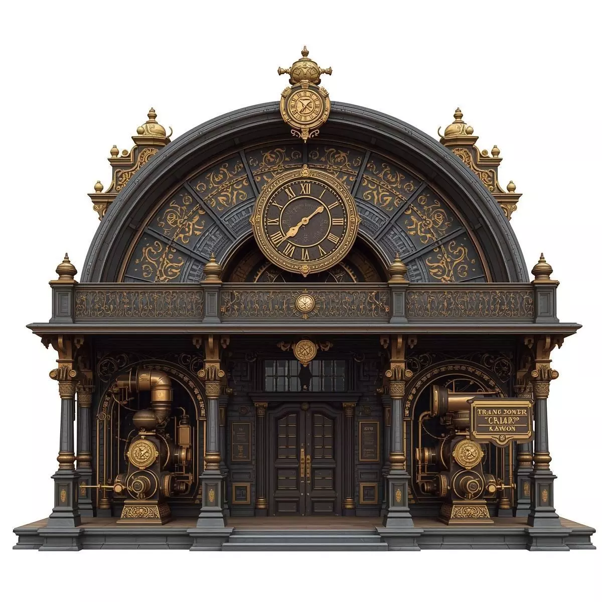 Tagssteampunk, train station, victorian, industrial, architecture, clockwork, gears, steam engine, arches, brass, iron, city landmark, travel hub, 3d model, game asset