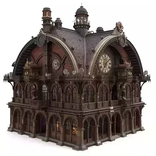 Tagssteampunk, train station, victorian, industrial, architecture, clockwork, gears, steam engine, arches, brass, iron, city landmark, travel hub, 3d model