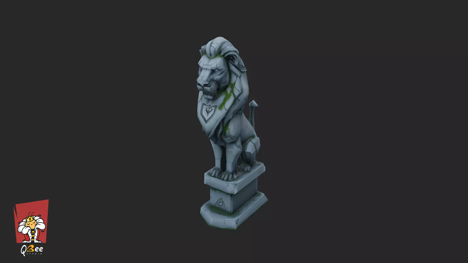 This high-quality 3D asset features a stylized, noble lion statue perched upon a stone plinth. With its hand-painted aesthetic and weathered details, it is perfectly suited for fantasy environments, temple ruins, or royal courtyard settings.