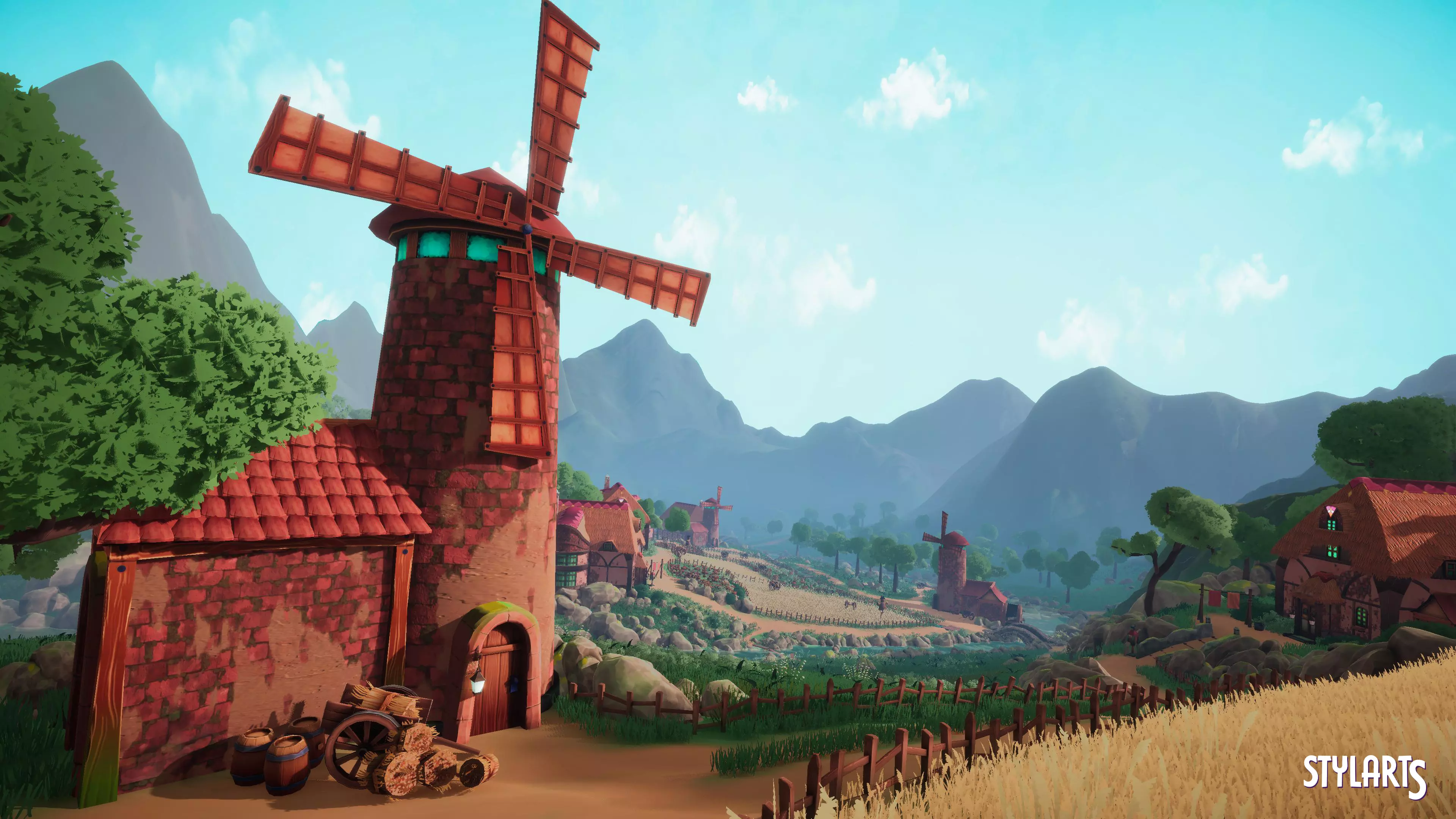 Props: Barrels, crates, fences, wooden bridge, cart, signboard, rocks, vegetation, trees, bushes, grass, crops, lamps, windmill parts etc.. [Resolution 2048x] [Diffuse, Normal, Roughness, Opacity, AO, Metalic]