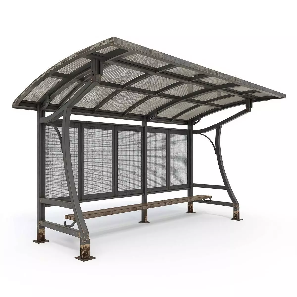 Tagstransit shelter, 3D commuter model, bus stop, urban infrastructure, weathered metal, game ready prop, public transport, PBR textures, architectural asset, street furniture, mesh screen, realistic city prop