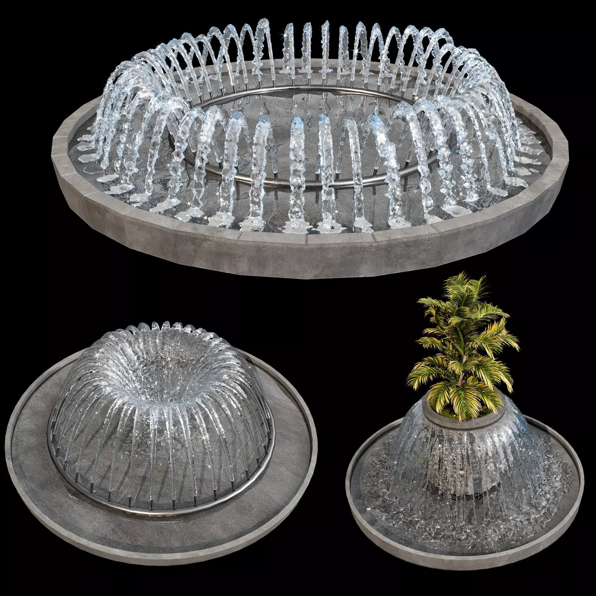 The model includes 3 different circular water fountain.