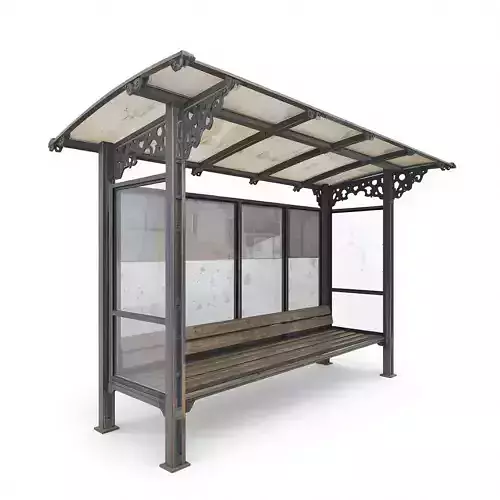 The design highlights a robust modular metal frame with ornamental scrollwork brackets, supporting a translucent multi-paneled roof system. It includes integrated seating with weathered timber slats and large glass windbreak panels featuring realistic surface smudges. Engineered with clean topology, this game-ready prop is fully optimized for real-time engine integration and detailed architectural visualizations.