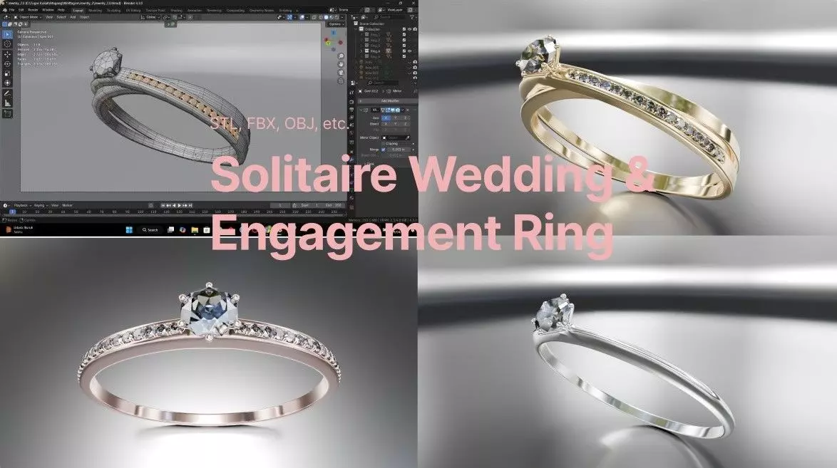 This is a high-quality 3D model of a Solitaire Wedding / Engagement Ring, featuring 3 unique ring designs (with identical gemstone setting) and 3 different material color variants: Gold, Rose Gold, and Silver. The model is built with clean geometry and is ready for 3D visualization and 3D printing. Ideal for jewelry designers, product visualizations, digital showcases, and manufacturing workflows.