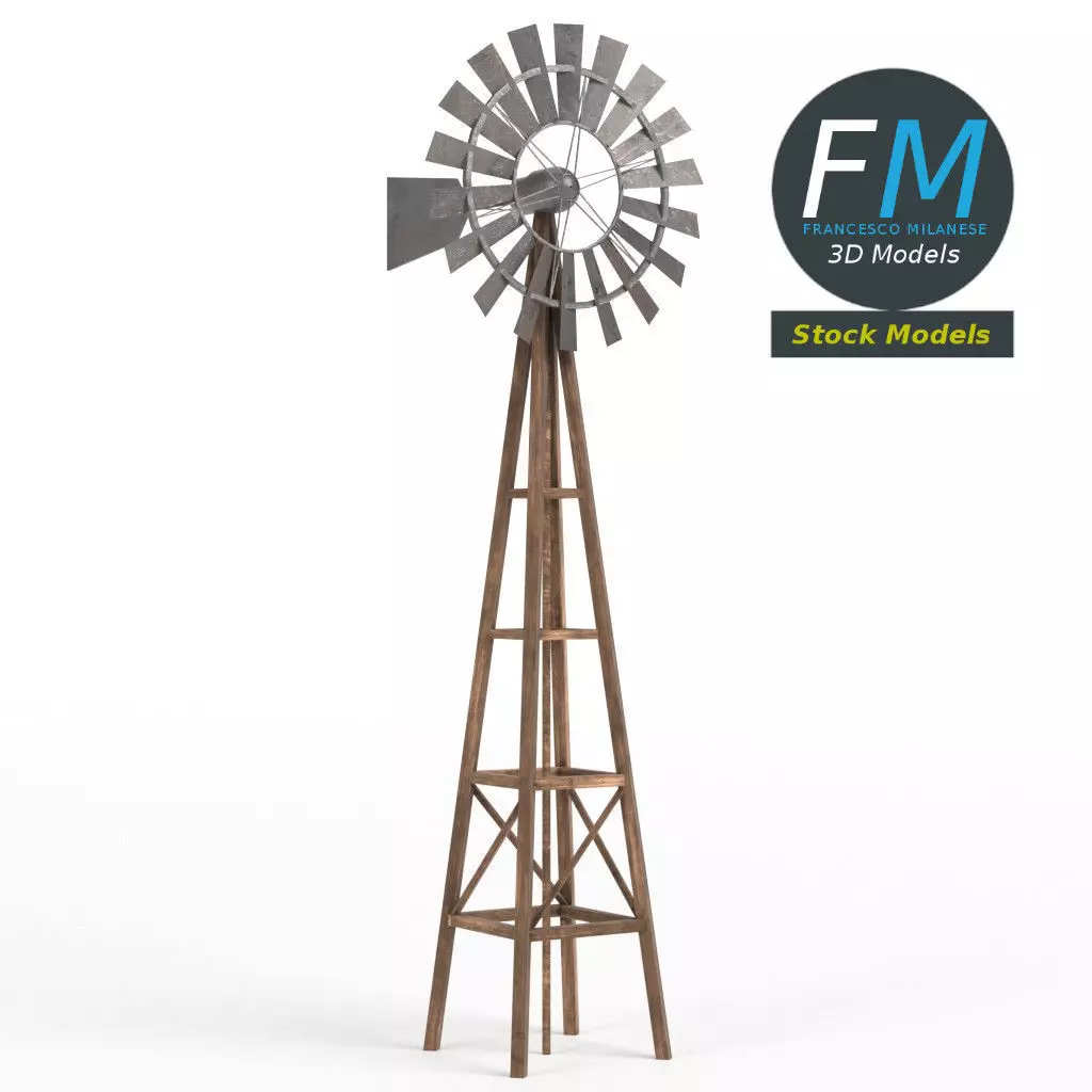 Windpump (water pumping windmill) 3D Model. 3 individual objects (tower, blades, tail; so, you can easily rotate or even animate it), sharing the same non overlapping UV Layout map, Materials and PBR Textures set. Production-ready 3D Model, with PBR materials, textures, non overlapping UV Layout map provided in the package.