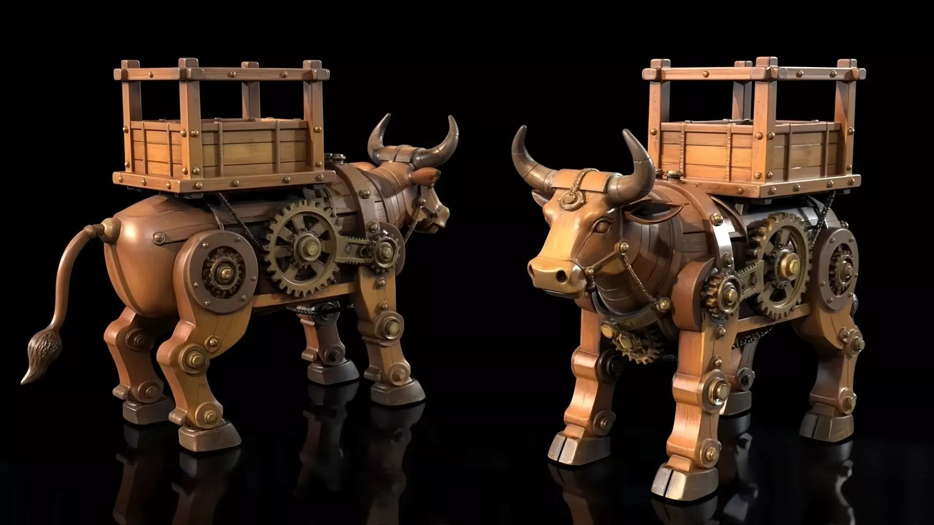 This is a 3D concept design inspired by the wooden ox and flowing horse invented by Zhuge Liang during the Three Kingdoms period, infused with a steampunk aesthetic. The main subject is a mechanical ox constructed from solid wood, brass gears, rivets, and chains. The gear-driven transmission structure at its joints is clearly visible, preserving the biological form of an ox while embodying the industrial beauty of precision machinery. A wooden cargo box is mounted on its back, creating a striking fusion of ancient Chinese mechanical craftsmanship and modern industrial aesthetics. It resembles a functional, retro transport device, blending the mystique of historical legend with the rugged texture of the industrial age.