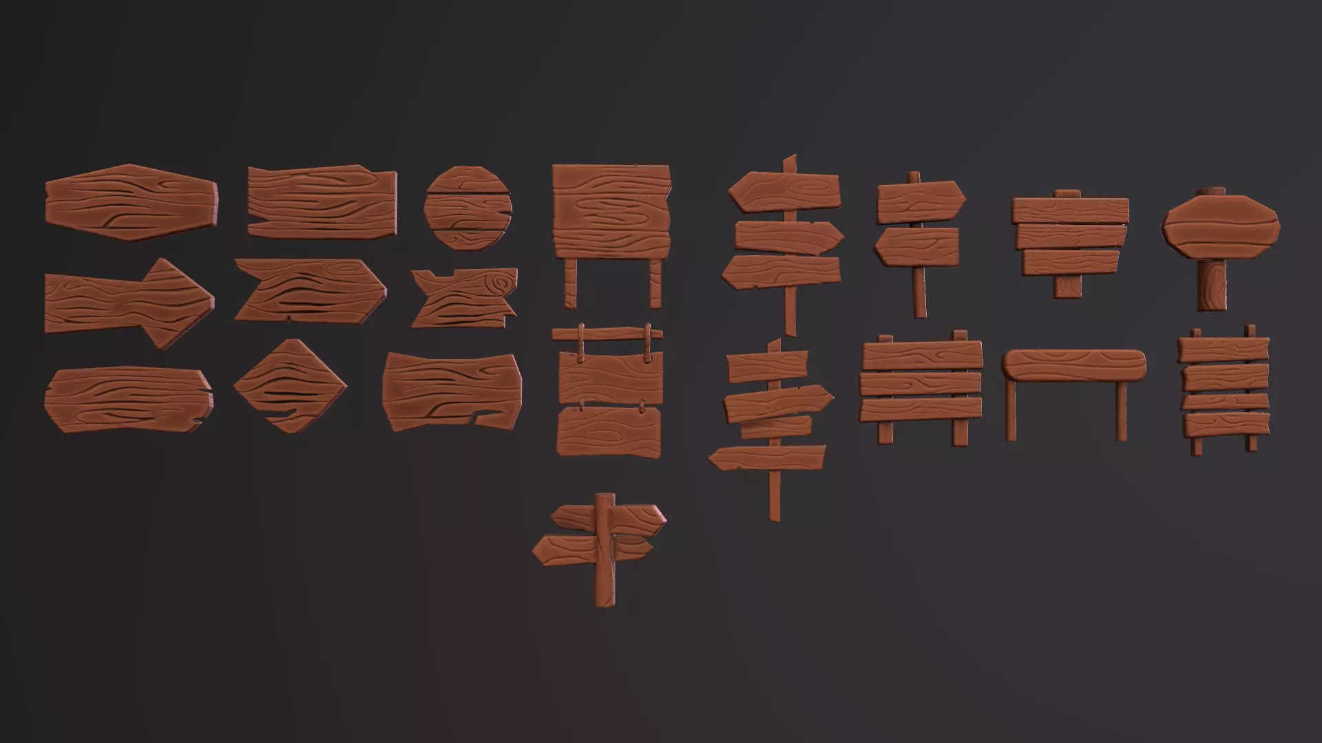 Wooden Signs Stylized Wood includes 20 stylized wooden signs that you can use in any engine.