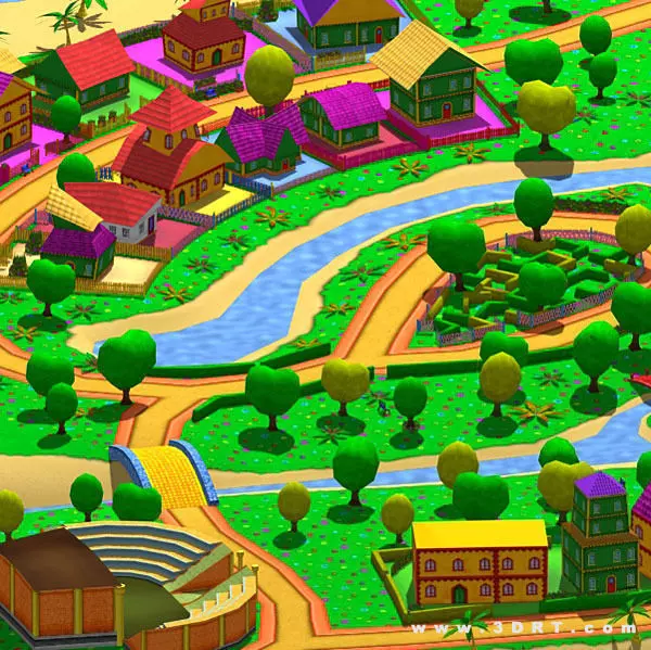Over 200 custom objects: Houses, trees, windmills, shops, bridges, plants and more. Triangles count: