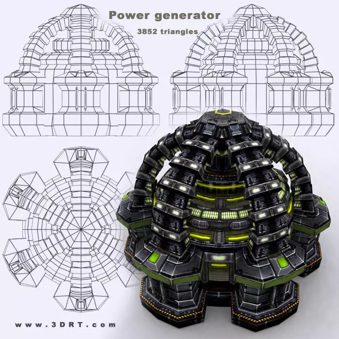Power Generator 3D model. Full building with interior is textured with a single 2048x2048 texture pattern Normal, specular and illumination maps are included. 3 extra construction stages models included. Separate animated file of quick building. Triangles count - 3852