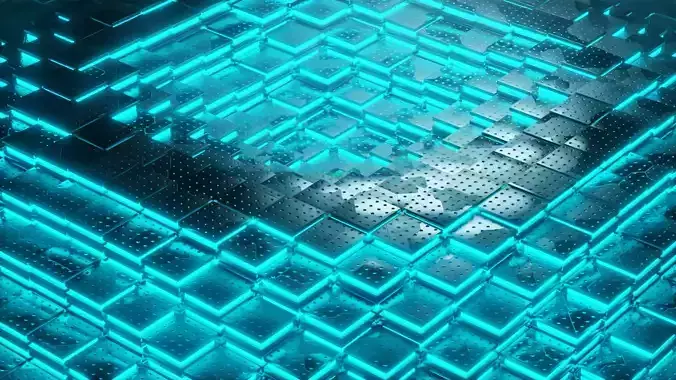 Cybernetic Pulse – 3D Animated Sci-Fi TilesInfuse your visual projects with a high-end futuristic aesthetic. This procedural 3D animation features a dynamic interaction between industrial metallic surfaces and intense cyan neon lighting, creating a mesmerizing digital wave effect.