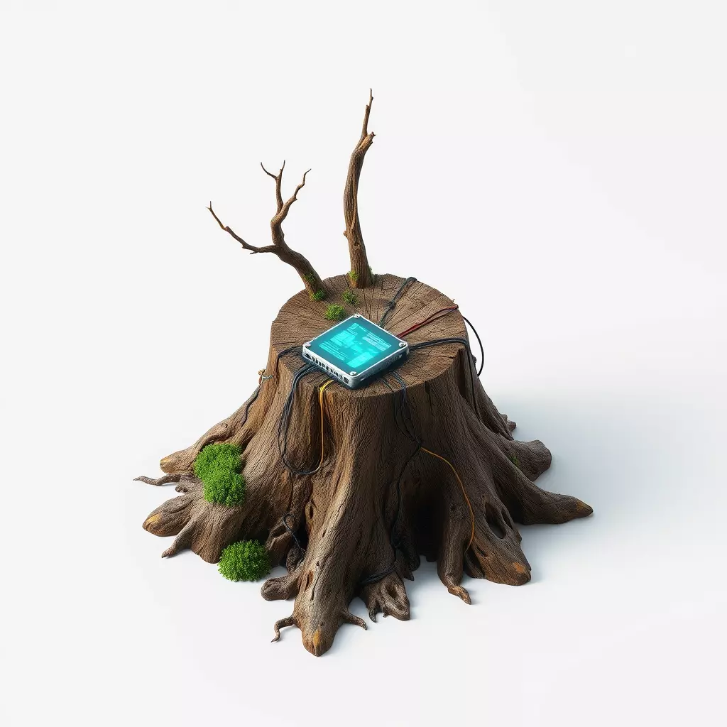 This meticulously crafted 3D model presents a captivating fusion of nature and advanced technology, featuring a rugged tree stump intricately integrated with a futuristic control device. The aged, textured tree stump, adorned with patches of vibrant moss and dry branches, provides a striking contrast to the sleek, metallic device resting on its surface. Illuminated by a glowing blue screen, the device is connected by numerous cables, suggesting a crucial data link or energy source within an organic environment. This versatile asset is perfect for a wide range of creative projects, including sci-fi game environments, post-apocalyptic landscapes, cyberpunk cityscapes, or any digital art requiring a blend of the natural and the artificial. It is ideal for use in game development, architectural visualization, augmented reality (AR) applications, virtual reality (VR) experiences, and high-quality static renderings. The model boasts clean topology, efficient UV unwrapping, and is ready for subdivision to achieve even greater detail if needed. It includes PBR-ready textures to ensure realistic material representation across various rendering engines. Supported file formats typically include GLB, OBJ, STL, ABC, DAE, FBX, USD, and PLY, making it easily importable into most 3D software. Whether you need a low-poly asset for real-time applications or a high-detail prop for cinematic renders, this model offers the flexibility and quality to enhance your scenes.