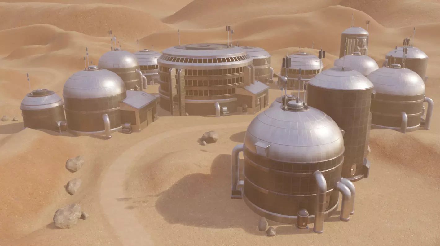 The scene is populated with dome buildings, central circular structure, sand dunes, rocky desert - details like silver metallic surfaces, rounded architecture, cylindrical structures add authenticity and depth. A versatile asset for sci-fi game levels, speculative world-building, and enterprise AI teams assembling training datasets for future environments.