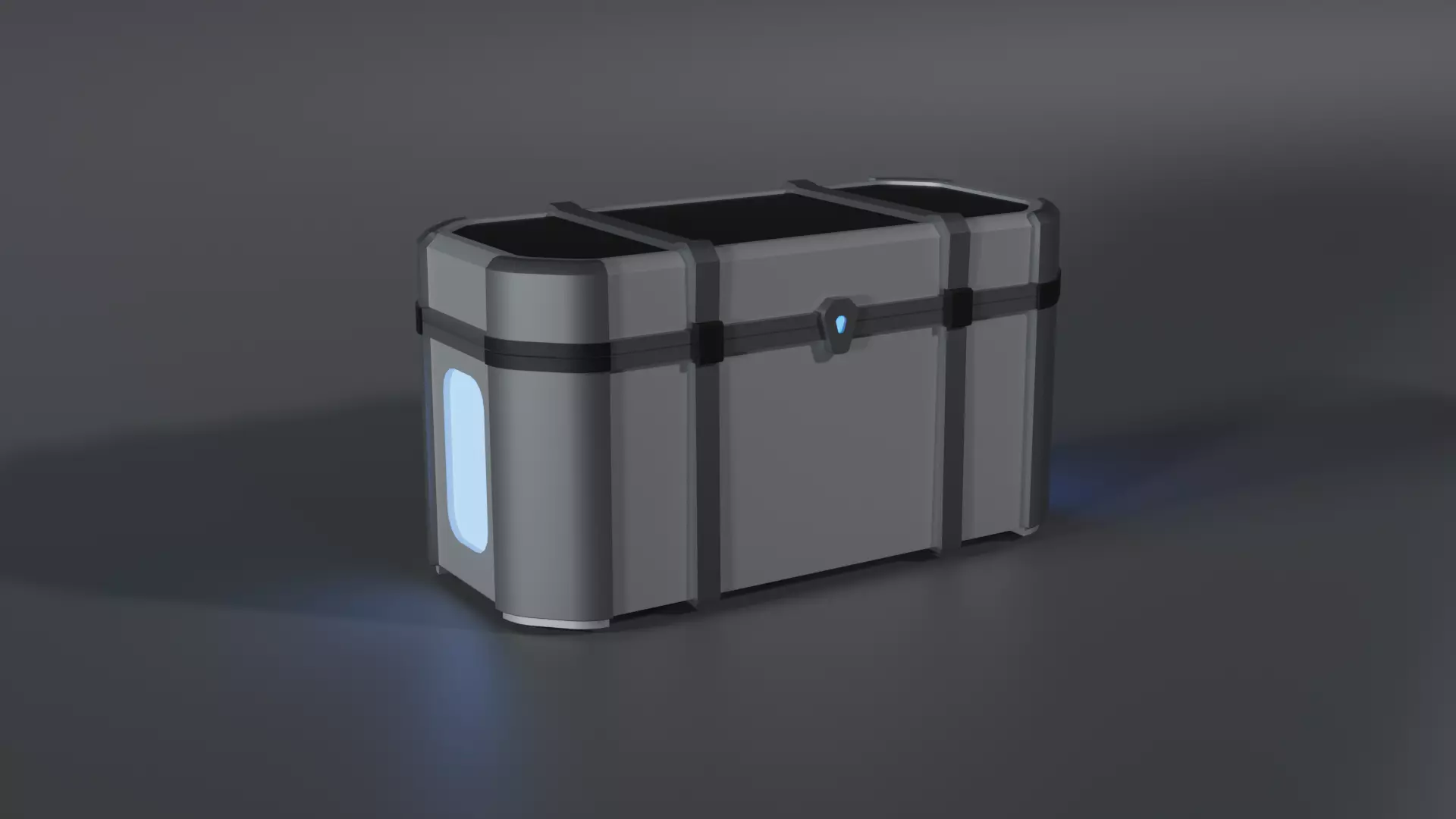 This metallic crate is designed in a futuristic style and features glowing accents. The design is simple yet modern.