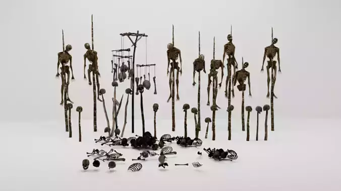 This pack delivers a dramatic, studio-ready skeleton scene designed to sell: multiple posed impaled skeletons, clustered skulls and scattered bones, plus modular spike props. Clean UVs, PBR materials and neutral white studio renders make the set perfect for product pages, VFX shots, game environments, Halloween decorations and premium visual merchandising