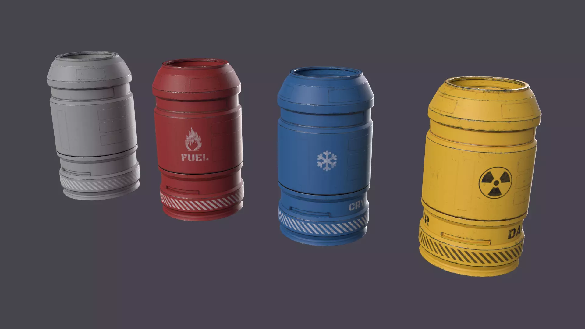 Low-poly Sci-Fi Barrel №3.Contain 4 models of Sci-fi barrel (white (standart), red (fuel), blue (cryogen) and yellow (toxin))Part of Sci-Fi collection, which contains some sci-fi props.
