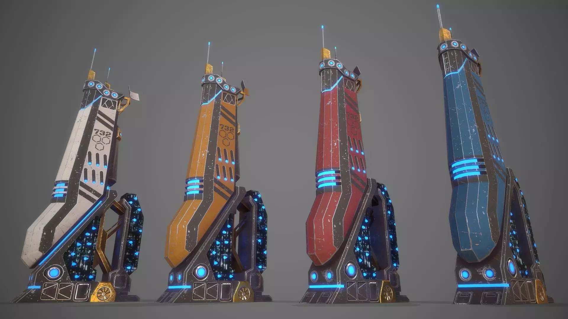 Supports Built-in Render Pipeline and URPNumber of Meshes:1 (OBJECTS)Number of Materials: 1Number of Textures: 8Textures uv 2048-2048(PBR)=Normal--Metallik--Roughness--Emissive--BaseColorFour different base colors White,Blue,Yellow,RedFour different emissive colors Pink,Blue,Orange,GreenProperly named Textures,Materials and MeshesModel is fully textured with all materials applied. You can edit the material :))The pivot points are properly positioned.building 12 Polygon 811Model completely unwrapped.Texture 2048-2048PBR AVAİLABLEModel is fully textured with all materials applied.Pivot points are correctly placed to suit animation process.