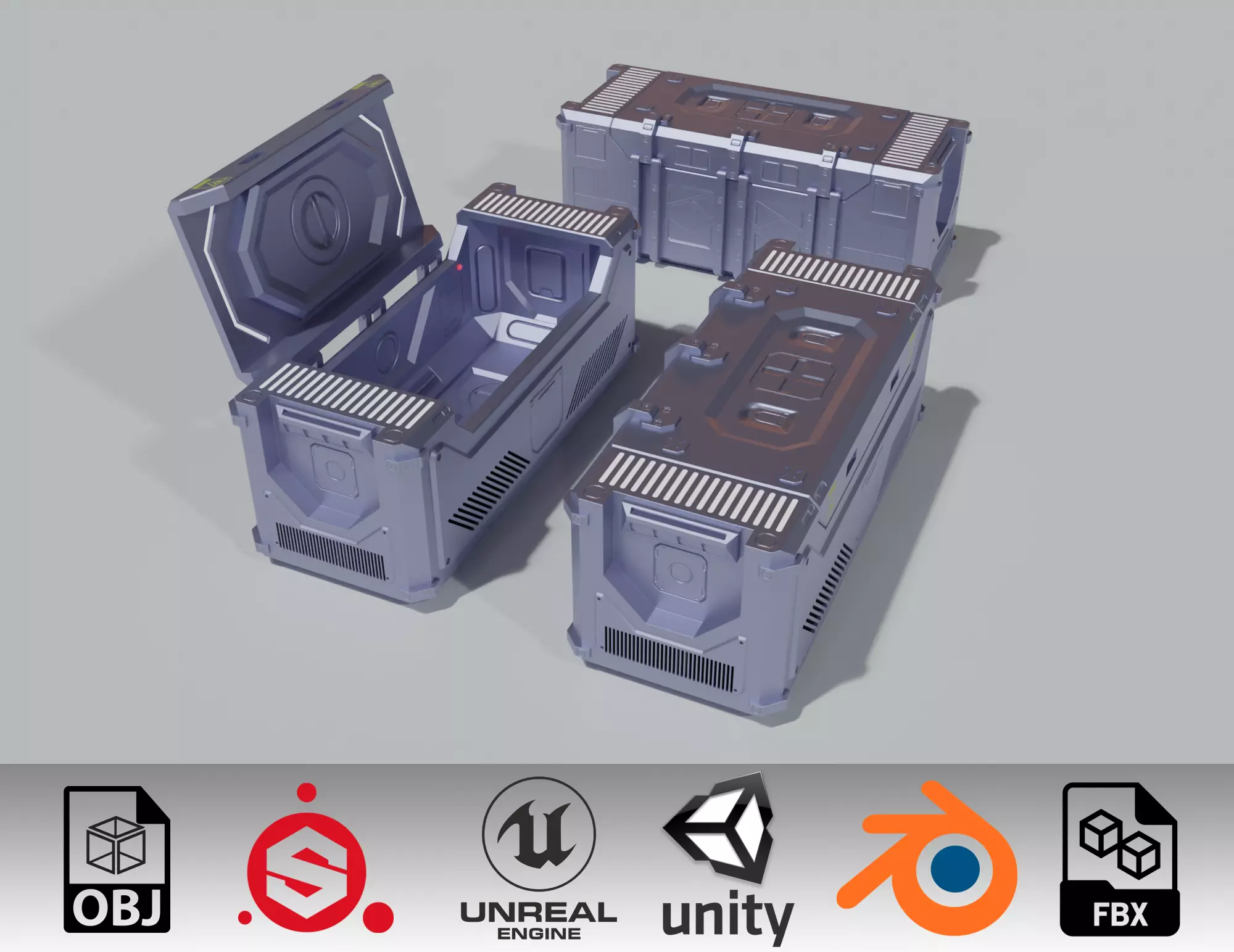 Hello there! I am pleased to introduce you this lowpoly 3D model of Sci-fi container.Fully triangulated, contain simple animation (open/close) - you can see it on Marmoset toolbag preview. Ideal for games, VR/AR etc. Also can be usable for renderings.Contain 3 types of meshes: .blend; .fbx and .obj; 3 types of textures: Standart PBR textures, Unity textures and Unreal engine texture set AND Substance Painter .spp file if you want to make some changes.Feel free to contact me if you have any quetions.
