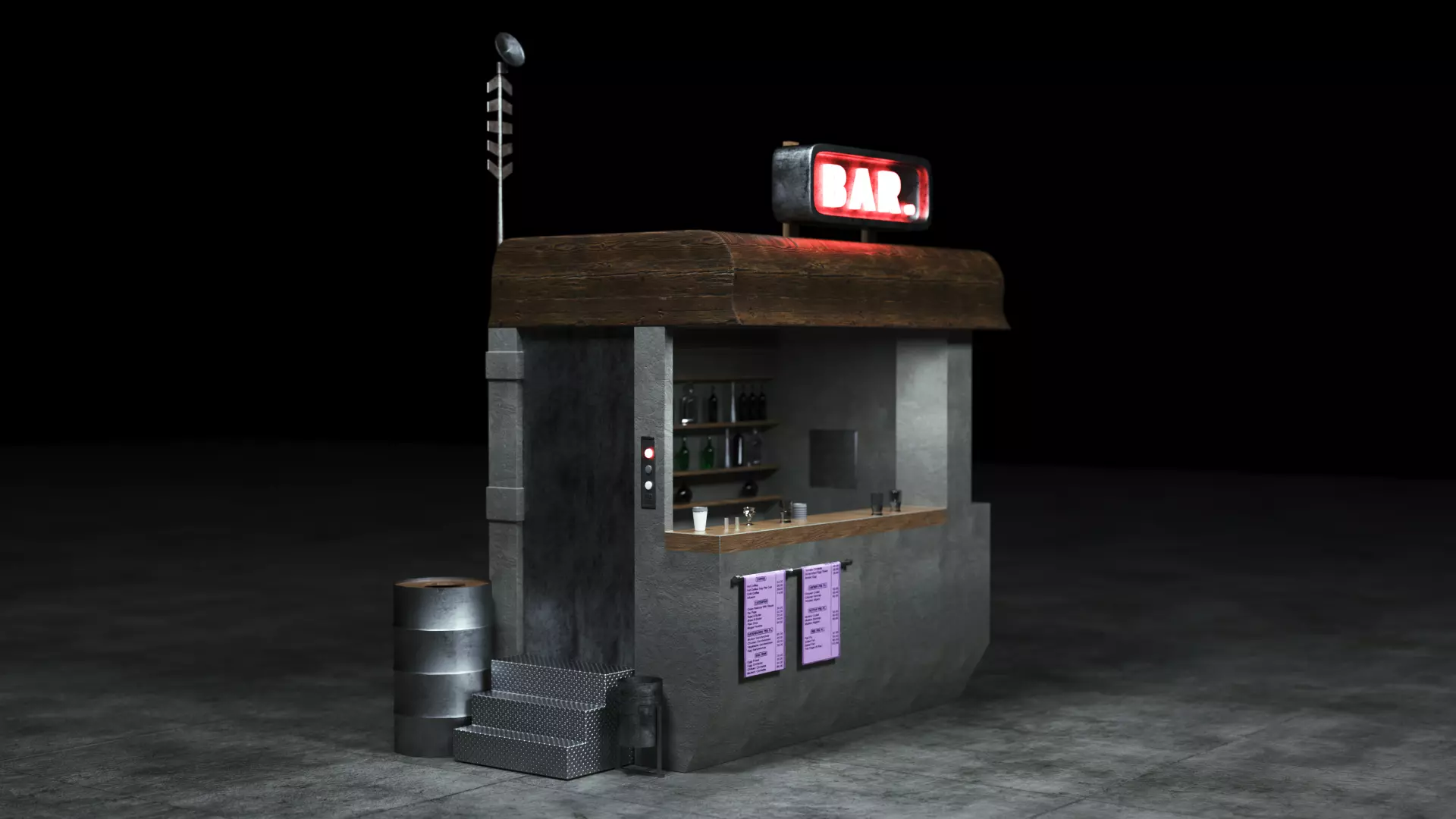 Mid detail and low-poly Sci-Fi street corner bar, but you can subdivide any part to better photorealistic result. You can customize it for any reason and add any other furniture and textures. Details: Great and minimalistic bar with all parts. The model is divided on objects for any changing in your work process. With texture and ready for renders in Octane. Formats: Native format (.c4d) - R21. No 3rd party software/plugins are required for using the model, but Octane texture setup (2020, 1.5 R4) provided in the c4d file! You can easily change it for native. All material included in tex.zip.