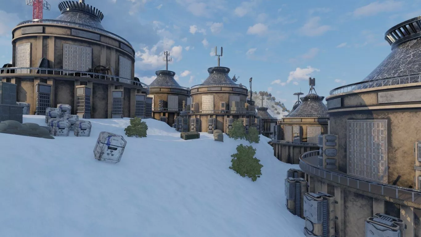 Filled with snowy hillside, futuristic round buildings, mountain village, antennas, the environment rewards closer inspection with touches like domed rooftops, communications towers, snow-covered terrain, scattered shrubs. Designed for sci-fi game environments, real-time rendering pipelines, and AI synthetic data covering futuristic or speculative architecture.