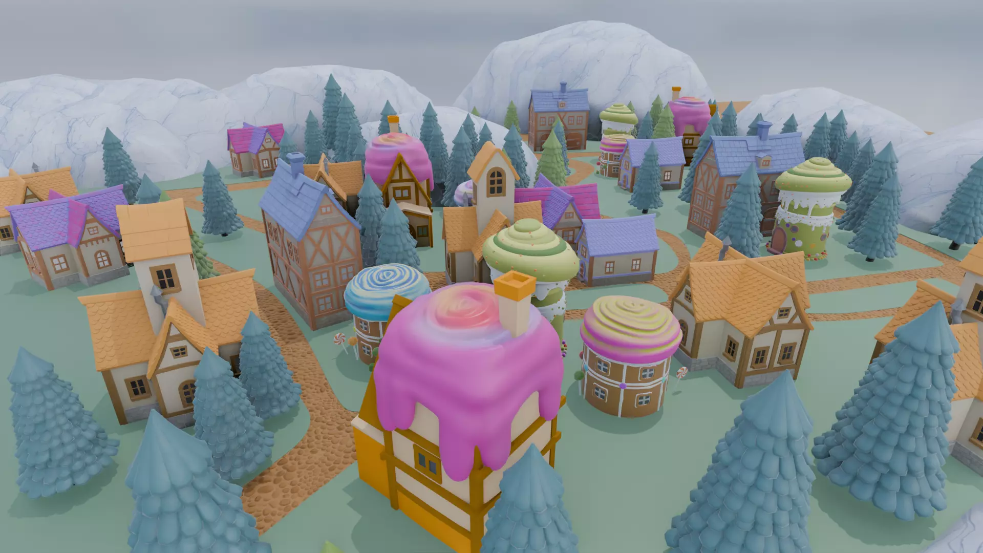 Notable assets include village, candy houses, pine trees, complemented by fine touches: pastel colors, frosted rooftops, lollipop decorations. A natural fit for fantasy RPGs, animated film lookdev, and AI training sets needing imaginative, non-realistic environments.