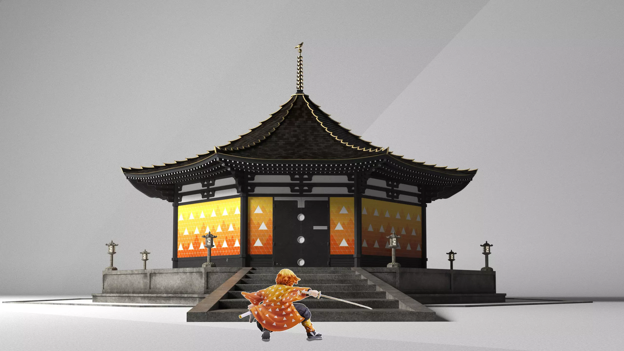 3D model of a japanese temple in tribute to Zenitsu Agatsuma's character on Demon Slayer, from the idea of transforming anime characters into buildings. This would be the first one.Architectural elements of the temple are inspired by the iconography of Zenitsu's character design (color, shapes, lighting).