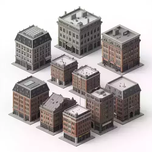 Modular Urban Building Kit 3D ModelsDescriptionThis is a high-quality 3D modular urban building kit, featuring a collection of realistic city architecture parts. The set includes a diverse array of multi-story structures designed with a mix of classical, mid-century, and modern industrial facades, primarily utilizing red brick, tan stone, and grey concrete materials. It is designed as a game-ready asset collection, ideal for constructing dense, high-fidelity urban blocks or city-planning visualizations.