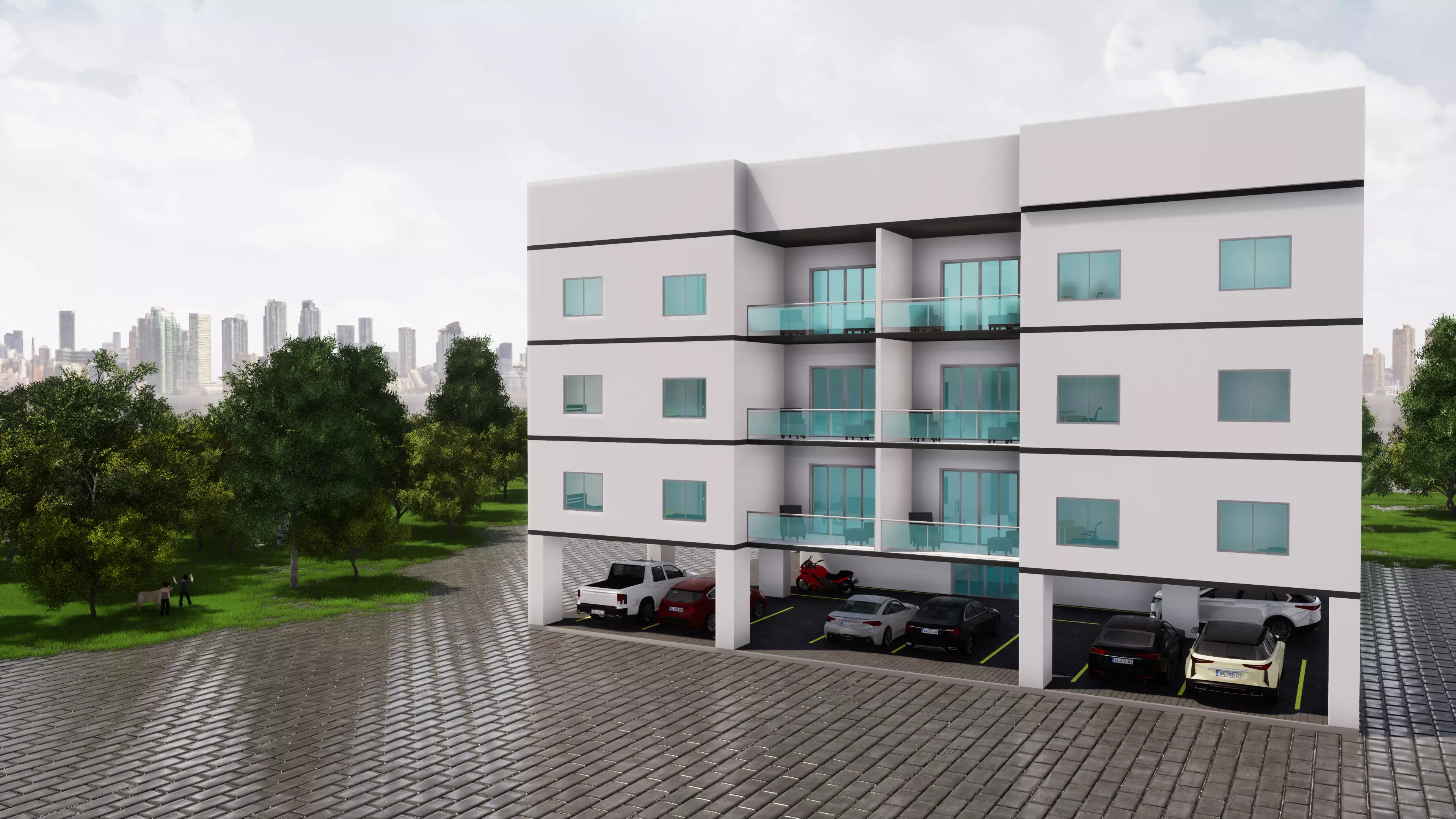 Projeto de uma edificação, que será construído em um lote com dimensões 30 x 35m totalizando uma área de 1050 m² . Tal edificação compreende um térreo mais 3 pavimentos tipo, totalizando uma área total construída de 2100 m², com estimativa para 48 pessoas. No térreo está localizado o hall e as garagens para os veículos (uma vaga por apartamento). Já cada pavimento tipo, conta com 4 apartamentos onde cada um possui sala, cozinha, um banheiro social, dois quartos, sendo um suíte. A edificação conta ainda com 2 reservatórios, superior e inferior, com capacidade total de 28.800 litros ou 28.2 m³. O primeiro possui 40% da capacidade total, compreendendo 11.520 litros ou 11,52m³, já o segundo possui 60% da capacidade que corresponde a 17.280 L ou 17,28 m³.