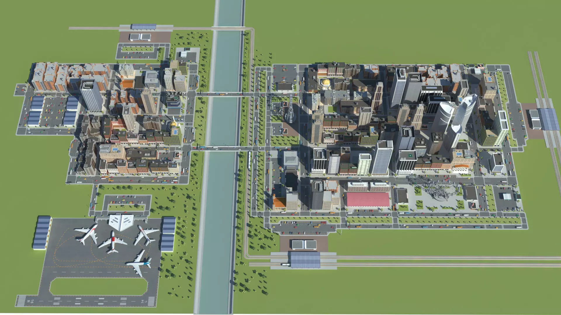 70+ different buildings include:-14 types of Skyscraper-City mall -Apartments -Hot pot house -Office buildings-Warehouse-Hospital-Catholic church-Mosque /Islamic church/-Train station building-Airport building -Car showroom-Ferris wheel-Gas station-Constructing buildingand other buildings