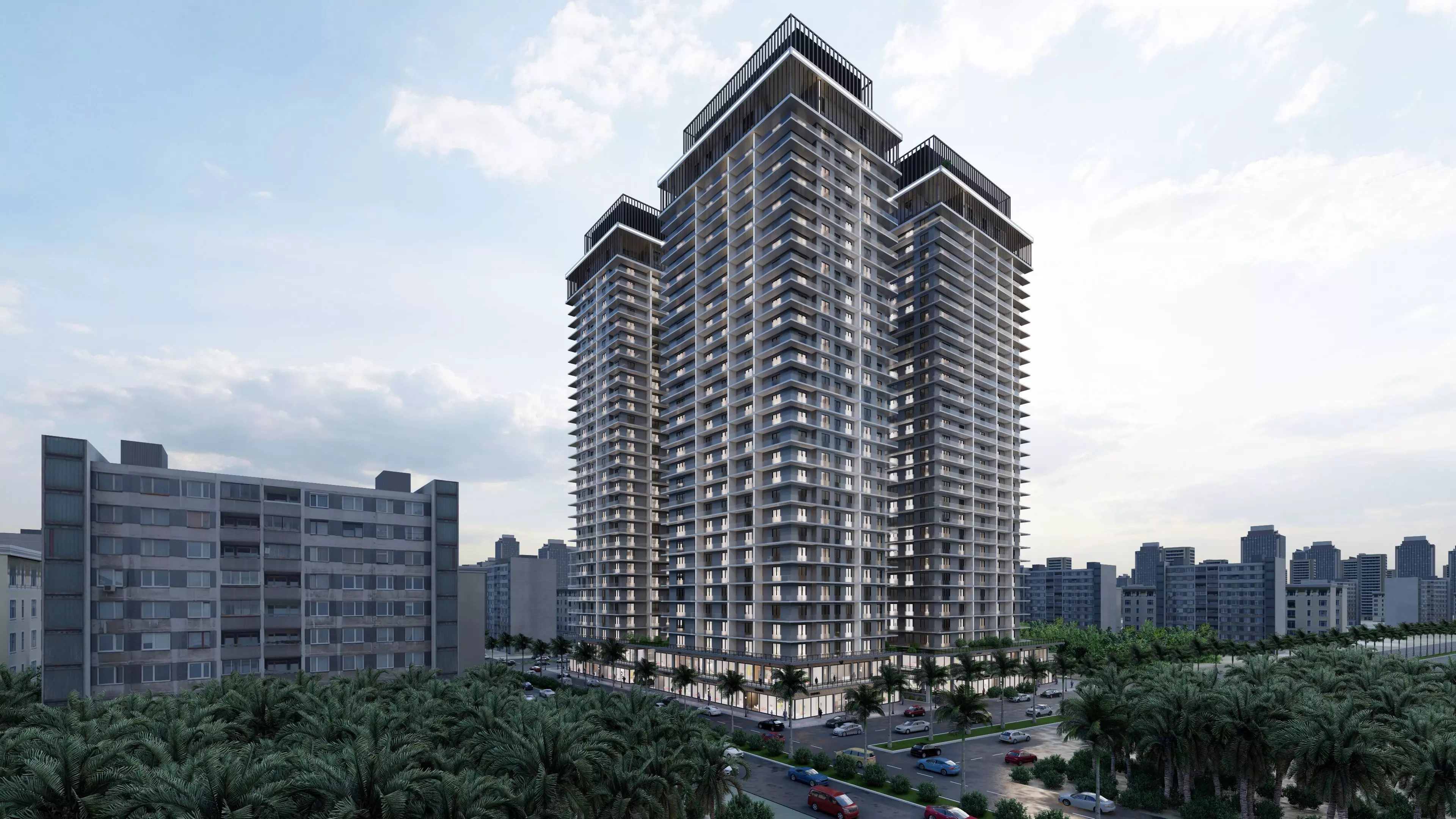 Features:High-rise buildings: Three tall residential towers with contemporary architectural design.