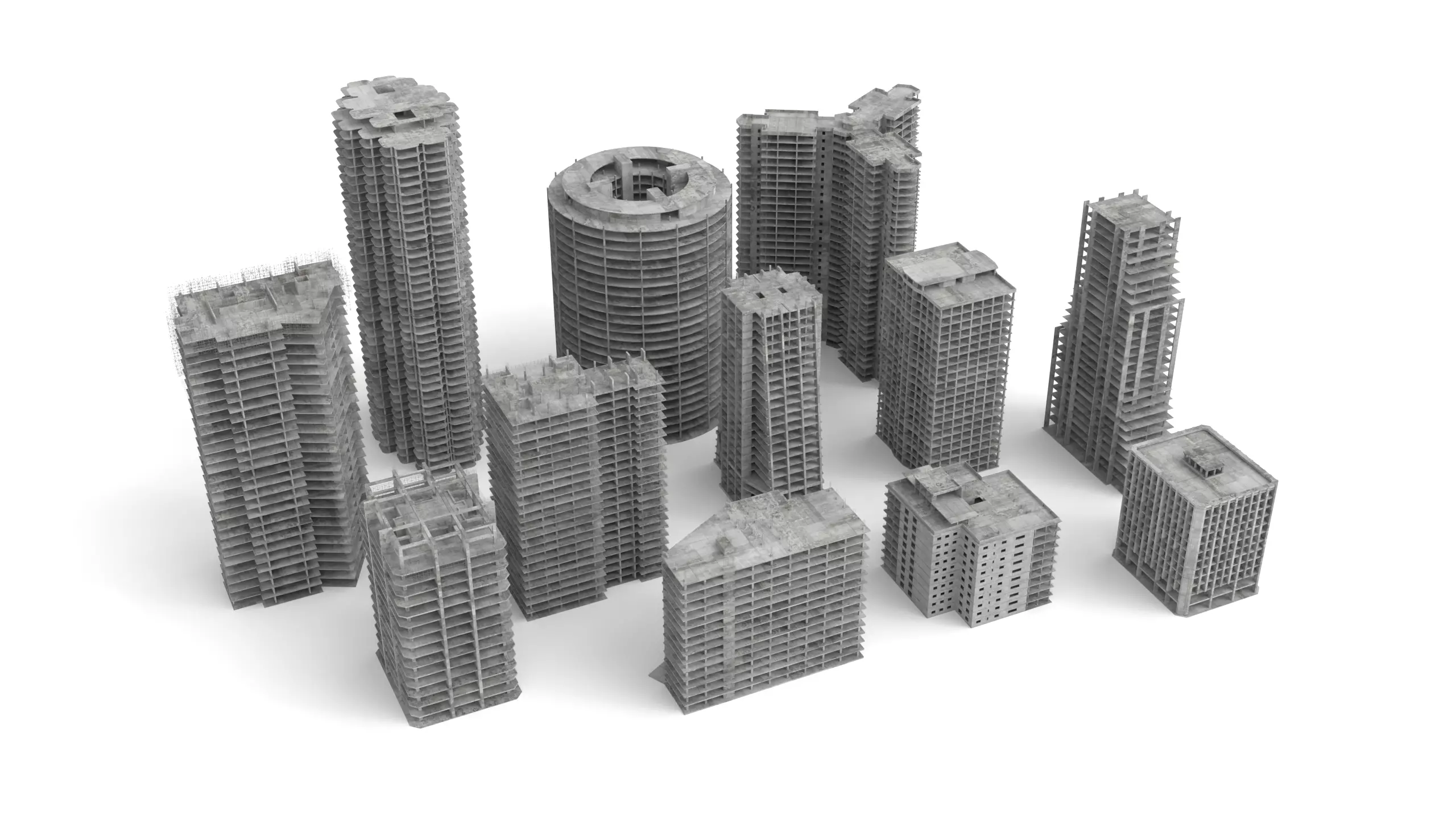 A set of 12 models, suitable for depicting under construction, unfinished, or abandoned buildings. All are primarially constucted from concrete. Scaffolding, barriers and and exposed rebar is included in some of the models to add detail. They use transparent textures.Tallest building is 138m, shortest is 39m. Footprints vary from around 25m on the shortest dimension and up to 70m on the largest.