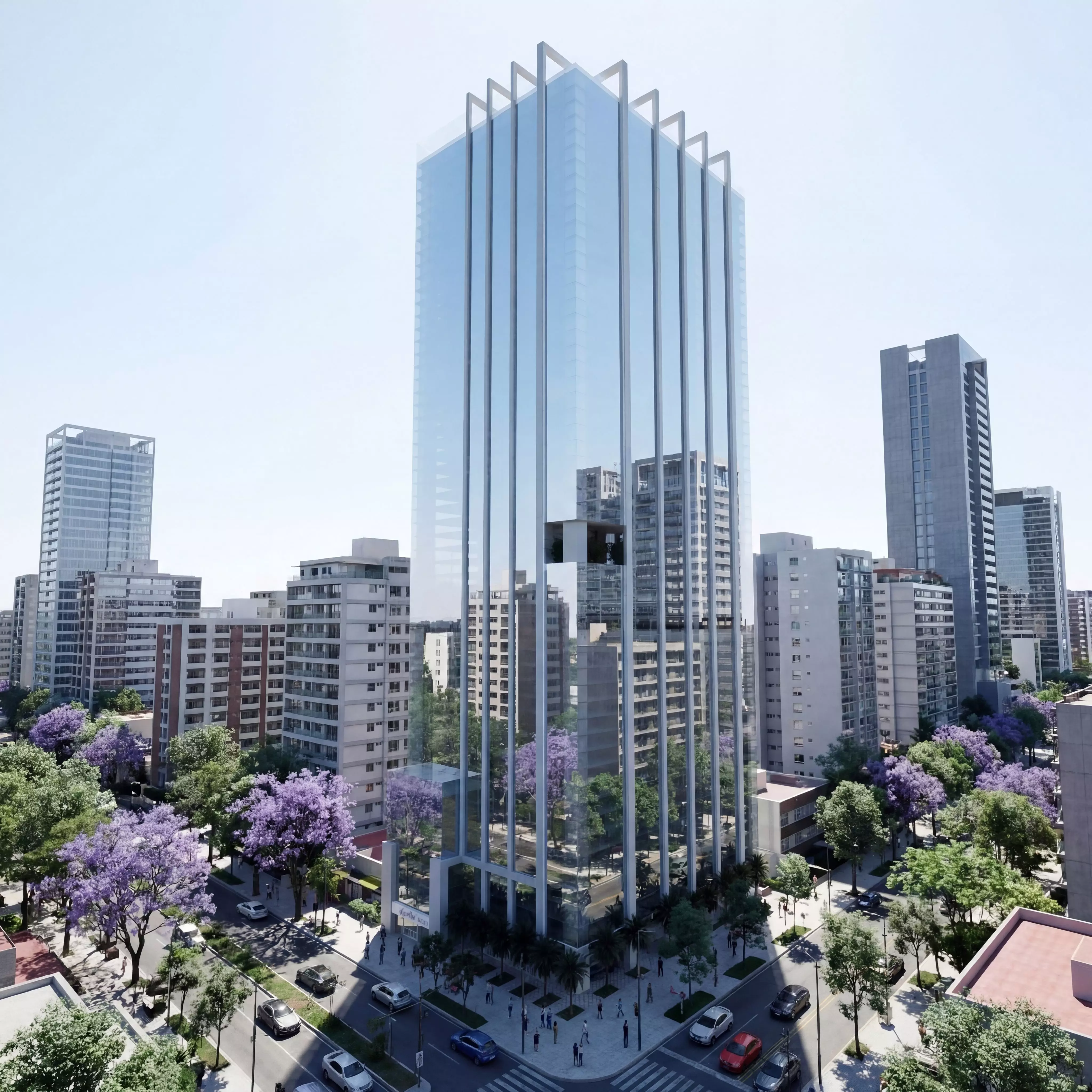 The tower features a strong vertical rhythm defined by continuous glazing and structural vertical elements, reinforcing its height and modern character. The commercial base activates the street level, creating a clear transition between public and private uses while supporting urban interaction and accessibility.