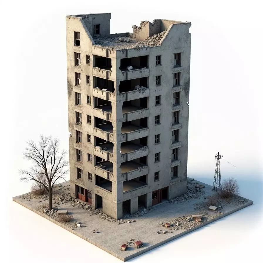 Key FeaturesDetailed Destruction Features realistic structural damage, exposed concrete, and debris on balconies and the roof.