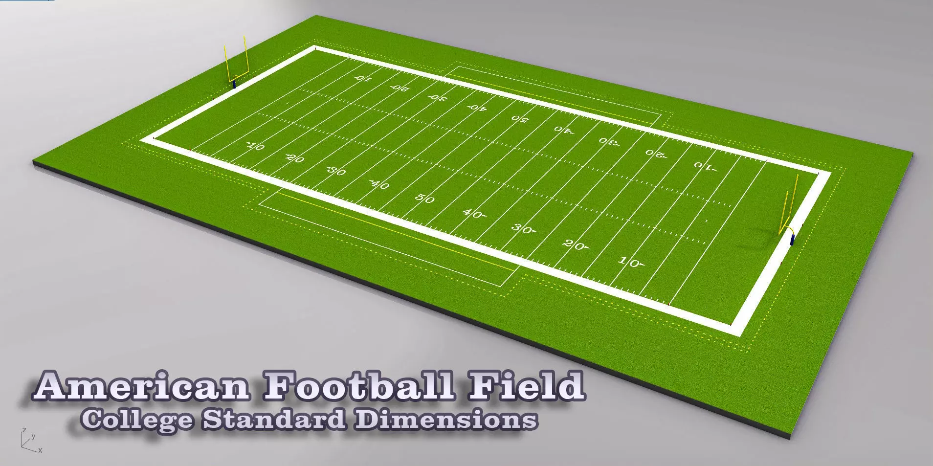 This is a realistic 3d version of american football field. All field lines, goal posts, field numbers, pylons , are accurately created by standard College field dimensions using CAD Methods.