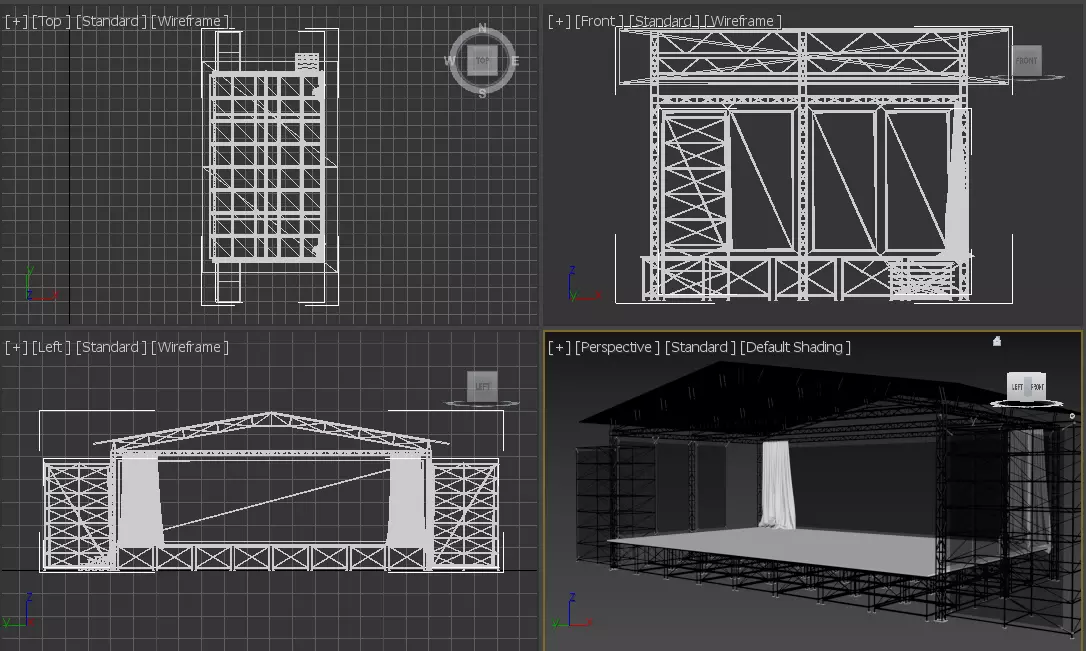 Estructura de escenario completa con lonas de rafia translucidas sujetas mediante cuerdas, soportes de anclado a suelo en la estructura, cortinas traseras y cubierta esterior a dos aguas , si exportas a unreal esta listo para activar nanite en la estructura y lod en las telas no consume casi nada de recursos